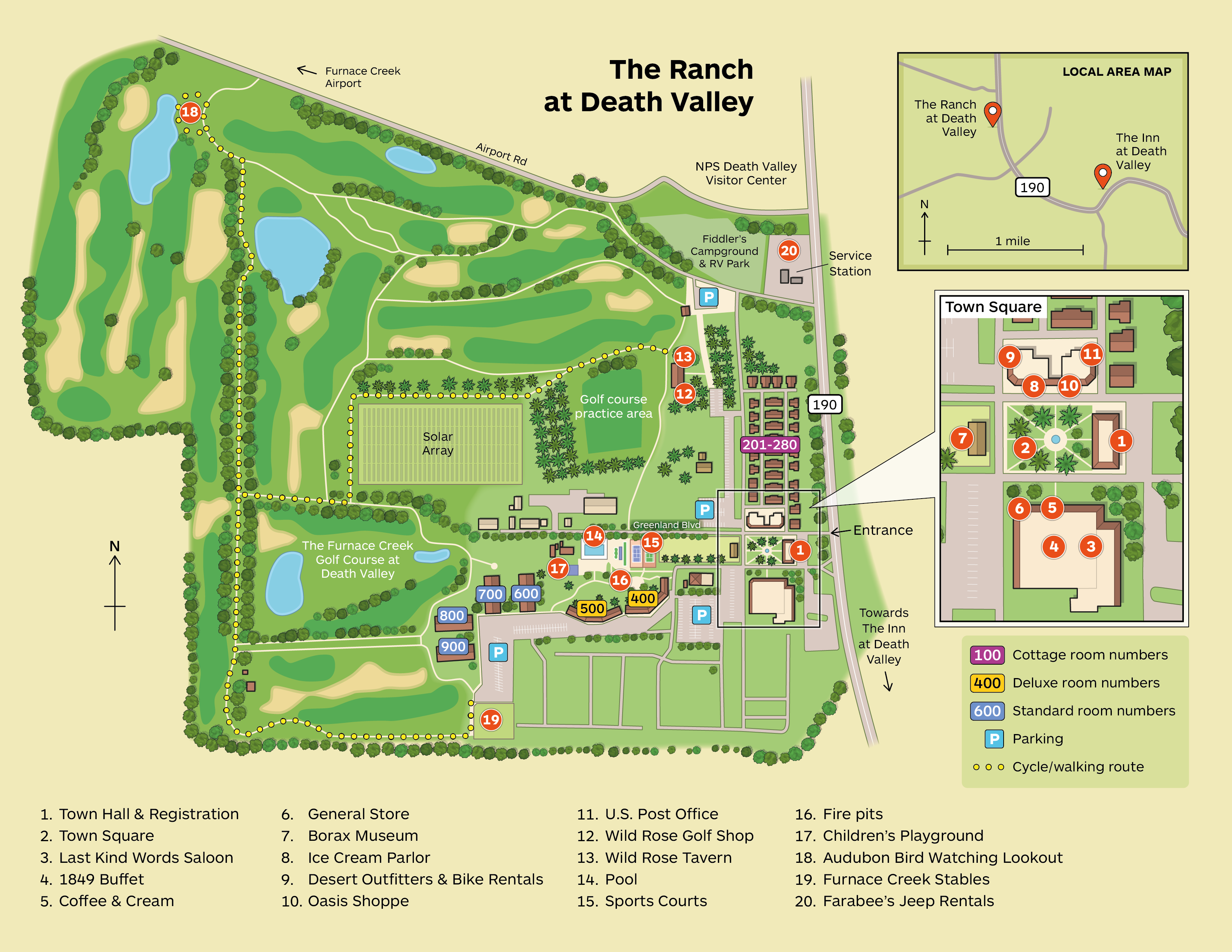 The Ranch at Death Valley, with its towering palm trees and true oasis atmosphere, is witnessing a redesign and evolution of the public space that dates to the 1950s. The vision of a more user-friendly “town square” in Spanish Colonial Revival style to be more sensitive to the environment, reduce traffic flow and provide better access to restaurants and the general store, has been completed. The Ranch offers the following amenities and activities to look forward to: